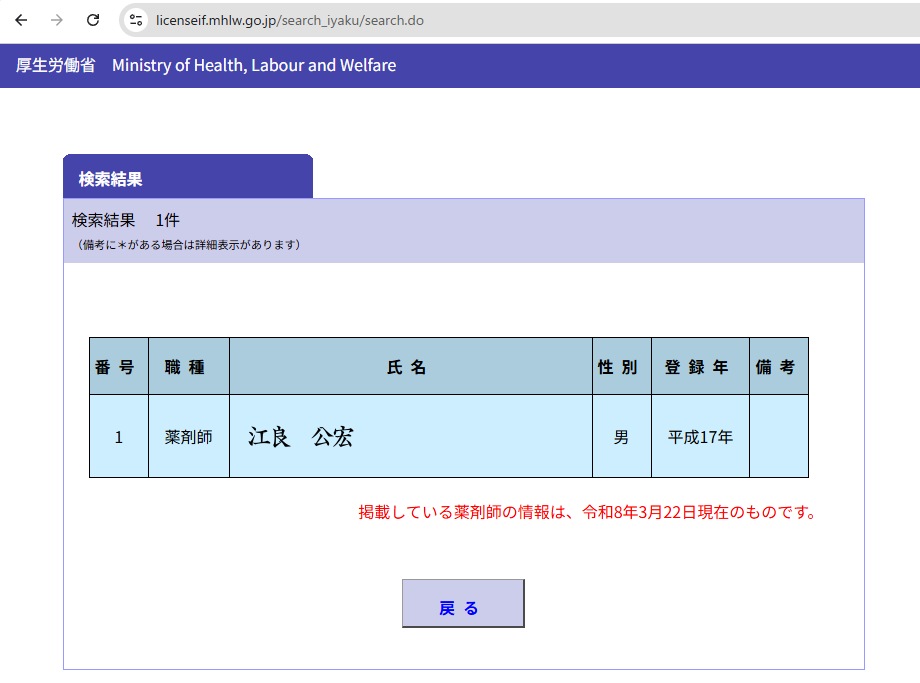 私の薬剤師の資格の有無については厚生労働省のサイトで調査できます。